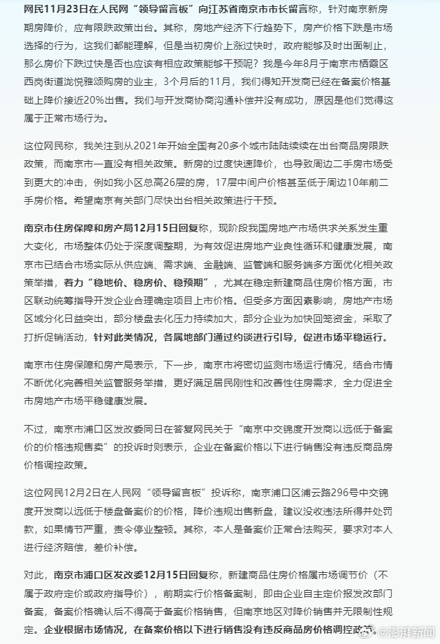 网民11月23日在人民网“领导留言板”向江苏省南京市市长留言称,针对南京新房期房降价,应有限跌政策出台。其称,房地产经济下行趋势下,房产价格下跌是市场选择的行为,这我们都能理解,但是当初房价上涨过快时,政府能够及时出面制止,那么房价下跌过快是否也应该有相应政策能够干预呢?我是今年8月于南京市栖霞区西岗街道泷悦雅颂购房的业主,3个月后的11月,我们得知开发商已经在备案价格基础上降价接近20%出售。我们与开发商协商沟通补偿并没有成功,原因是他们觉得这属于正常市场行为。