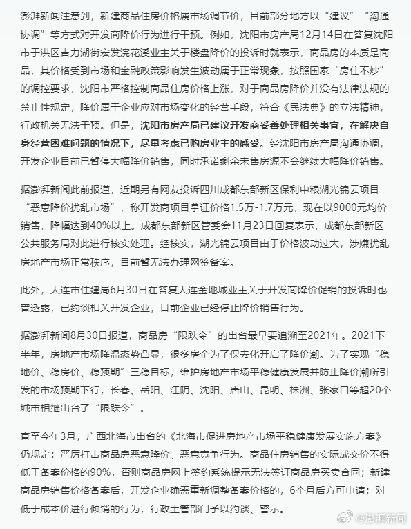 这位网民称,我关注到从2021年开始全国有20多个城市陆陆续续在出台商品房限跌政策,而南京市一直没有相关政策。新房的过度快速降价,也导致周边二手房市场受到更大的冲击,例如我小区总高26层的房,17层中间户价格甚至低于周边10年前二手房价格。希望南京有关部门尽快出台相关政策进行干预。