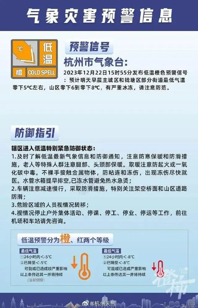杭州市气象台今天15时55分发布低温橙色预警信号:预计明天早晨主城区和钱塘区部分街道最低气温零下5℃左右,山区零下6到零下8℃,有严重冰冻,请注意防范。