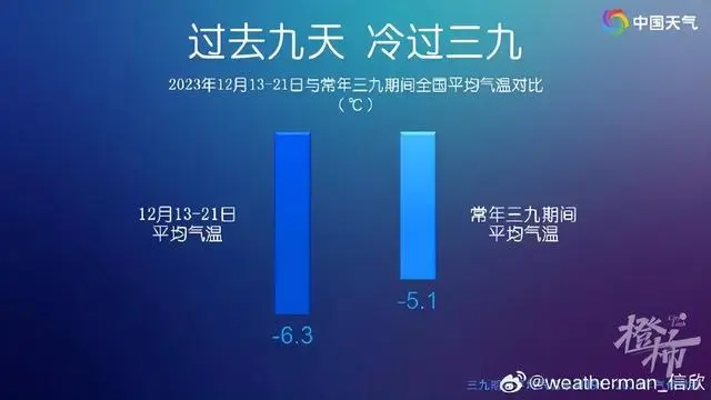 中国气象频道气象分析师信欣在微博上说,今天冬至,数九开始,把每个九天的气温做全国平均,通常三九期间最冷。但今年最冷未必是三九。冬至前的九天(12月13日-21日),因为寒潮影响,我国平均气温零下6.3℃,低于常年三九(零下5.1℃)。倘若今年数九期间,冷空气没有超常发挥,今年冬季最冷,没准是冬至的“前一九”。