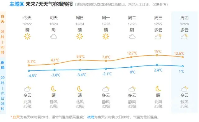 杭州市气象台预计,未来七天(22-28 日)我市连晴,明天早晨最低气温仍然很低,平原地区-4~-6℃,山区-7~-10℃,部分高山区-10℃以下,有严重冰冻。24~26日平原地区-2~-4℃,山区-5~-8℃,有冰冻或严重冰冻;23日起白天气温缓慢回升,完全回暖则要等到27日,预计最低气温将不再低于0℃。