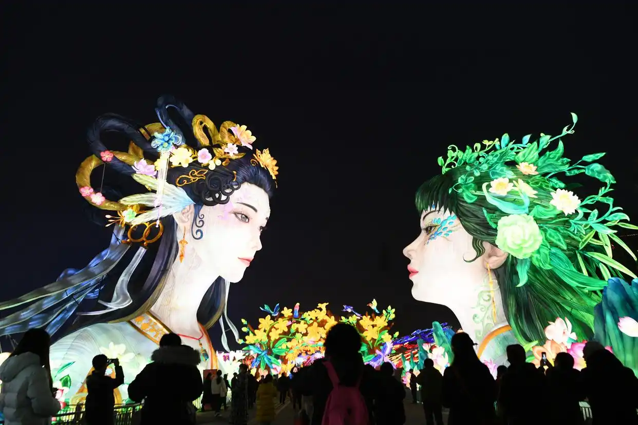 这是1月17日在四川省自贡市中华彩灯大世界拍摄的“青城双姝”彩灯。新华社记者 唐文豪 摄古老的赏花灯、逛庙会、闹社火习俗里,中国人对美的追求始终如一;先进的声光电技术加持下,春节之美呈现越来越丰富的表现形式。
