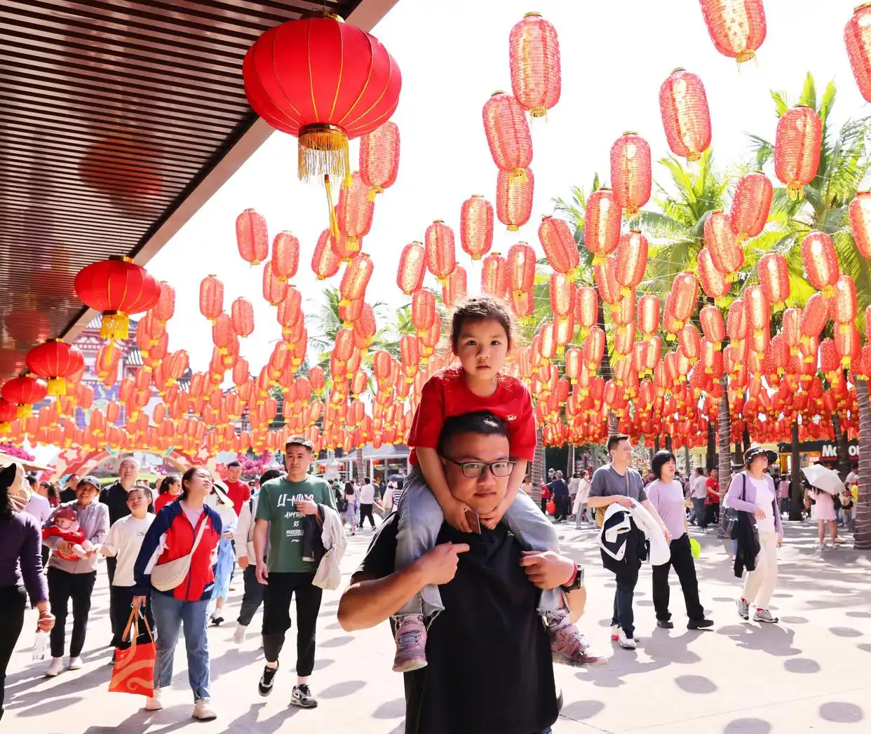 1月29日,游客在海南省三亚市南山文化旅游区游览。新华社发(陈文武摄)越来越多新年俗正在成长:逛大集、买潮玩、抢红包……在年轻人“花式”过节的时尚中,非遗国潮、春节年俗焕发新的蓬勃生机。