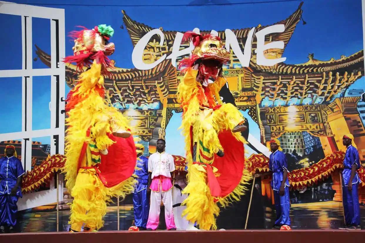 1月25日,在贝宁科托努的贝宁中国文化中心,演员在春节联欢晚会上表演舞狮。新华社发(塞拉芬摄)当“China Travel”成为2024年全球热词,升格“世界年”的春节引起更多人瞩目。
