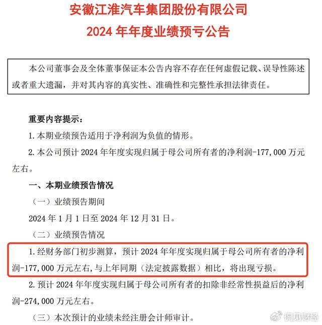 最近一年,江淮汽车股价涨幅达到196.55%。在东财-汽车整车板块的25只个股中,江淮汽车近一年股价涨幅位居第一,比排在第二的宇通客车高出近80%。尽管在二级市场上表现亮眼,江淮汽车的业绩却未能跟上股价的步伐。近期,江淮汽车披露了最新的业绩预告,预计2024年实现净利润约为-17.7亿,扣非净利润约为-27.4亿。与上年同期相比,2024年江淮汽车由盈转亏,扣非净利润的亏损程度明显扩大。去年前三季度,江淮汽车累计净利润为6.251亿,扣非净利润亏损2.312亿。这意味着去年四季度江淮汽车单季度净利润亏损近24亿,扣非净利润亏损近15亿,亏损程度显著增加。